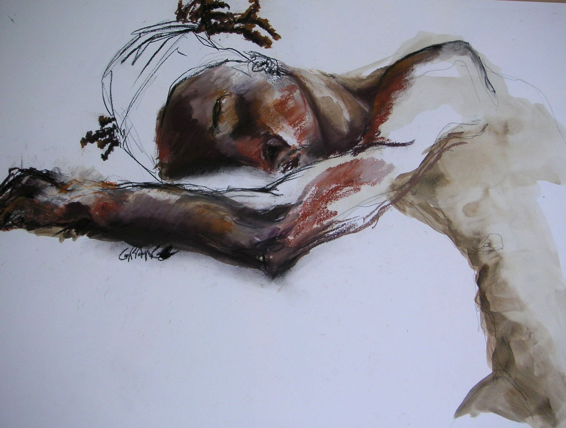 EN Cecil Grange is a draughtswoman and lime fresco artist whose work approaches drawing as a form of silent writing. Through vibrating lines, layered marks and earthy pigments, her practice explores the fragility and presence of the human body, revealing gesture, memory and emotion within the energy of the drawn line.